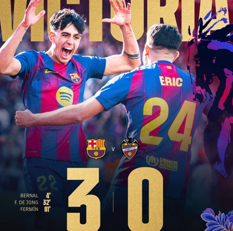 吉祥体育 – 西甲联赛中,巴塞罗那3-0战胜莱万特。贝尔纳尔进球,德容和费尔明也贡献进球